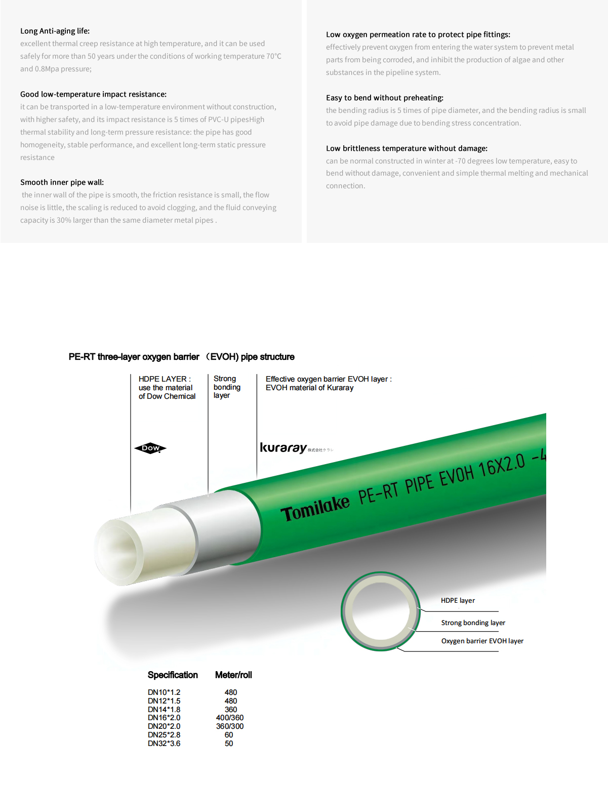 The role of oxygen barrier floor heating pipe: To slow down the formation of scale and microorganisms on the inner wall of the pipeline. Oxygen entering the pipeline can easily form scale with the calcium, magnesium and sodium plasma in the water. The high oxygen content in the water makes it easy to produce green algae and other substances. These two substances will accumulate on the inner wall of the pipe, affecting heat dissipation of the floor heating pipe system. Besides, it can delay aging of the floor heating piping system, slow down the corrosion of metal pipe fittings and equipment, and reduce the number of maintenance and cleaning of the floor heating system.Material : Dow Chemical,CONSTAB,LyondellBasell,KurarayOperating temperature: 0℃-95℃Operating pressure : 16-25kgSize: DN10X1.2 DN12X1.5 DN14X1.8 DN16X20 DN20X2.0 DN25X2.8 DN32X3.6